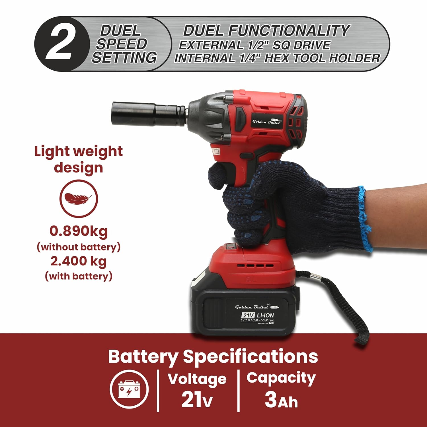 - High Torque and Performance: The Golden Bullet CIW 2145 delivers a maximum torque of 300 Nm with a no-load speed of 0-2800 rpm and an impact rate of 0-3400 ipm, ensuring powerful and efficient performance for various applications.